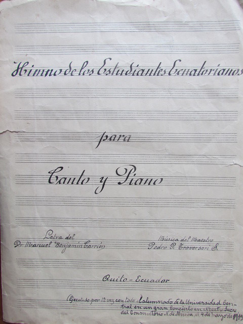 This piece was composed by Pedro Pablo Traversari Salazar (1874-1956) with lyrics of Manuel Benjamín Carrión Mora (1897-1979).